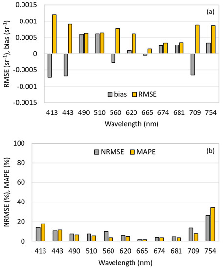 Error analysis for every Ocean and Land Colour Instrument (OLCI) band used in the model adjustment. Plot of (a) bias and root mean square error (RMSE), and (b) NRMSE and mean absolute percentage error (MAPE).