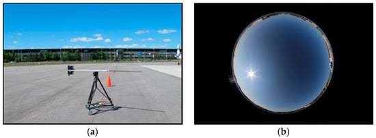 (a) Experimental setup for acquiring in-situ ground hyperspectral measurements of an asphalt target using the HR-1024i spectrometer. (b) The hemispherical sky photo was acquired simultaneously with the ground spectrometer measurements as a means of estimating the potential influence of cloud and visible aerosol (haze) during the time of data acquisition. All data were collected under stable conditions.