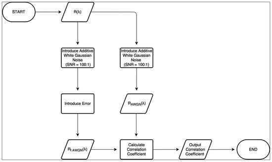 To test the persistence of the acquired trends with the presence of signal noise, the CC calculations for the last four modifications were repeated with AWGN. In particular, 4.31% AWGN was introduced to to acquire a new radiance signal, , with an SNR of 100:1, a reasonable value for airborne HSI data. A new transformed signal, , was acquired by applying transformation models from the last four rows of Table 1 to after introducing AWGN to generate a signal with an SNR of 100:1. The CC was calculated between and each in accordance with Figure 4.