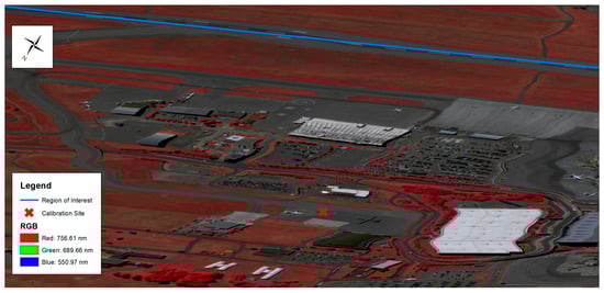Airborne HSI data were acquired on 23 June 2016 at 14:53:13 GMT and 24 June 2016 at 13:24:16 GMT over the Macdonald–Cartier International Airport (containing the Flight Research Laboratory calibration site) in Ottawa, ON, Canada (Figure 2). Asphalt is an ideal target for real airborne acquisition as it is effectively ubiquitous in urban settings and can be found on the roadway systems surrounding the studied area. Furthermore, the surface reflectance of the material has a low amplitude (nearly flat), smoothly varying spectral response and is thus useful for in-field pseudo-calibration and validation [].