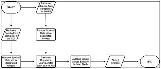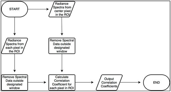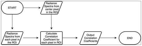 The spectrum from the center asphalt pixel in the ROI was designated as the reference for the application of the CC since it was the center of the instruments’ FOV. The center pixel was evaluated to ensure that it was a reasonable reference that contained no obvious errors. A CC was calculated between the spectrum from each pixel in the ROI and the designated central pixel reference in accordance with Figure 6.