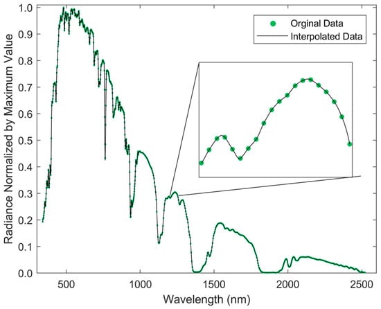 Averaged and normalized ground spectrum of asphalt before and after interpolation. The differences between the two curves can be seen in the subplot, which zooms in on the 1185–1255 nm spectral window. The interpolated curve, , was used for the methodologies described in Section 2.3. The mean squared error between overlapping data points before and after interpolation was negligible (<10−30). The Akima interpolation method generated a qualitatively smooth .