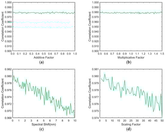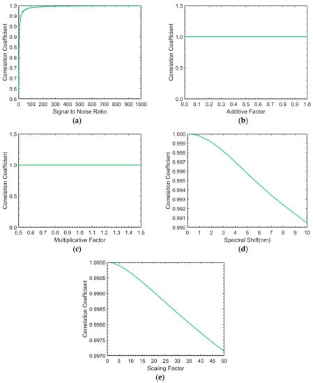 The CC remained invariant to linear transformations (Figure 11a,b). However, the average value of the CC reduced to approximately 0.98. Although the detailed relationships in Figure 11c,d were masked by the variation induced by the introduced noise, the first-order trends are clearly present and identifiable. The CC reduced from 0.980–0.968 after a 10 nm spectral shift in Figure 11c. As the scaling factor increased from 0–50, the CC decreased from 0.9815–0.975. At an SNR of 100:1, the average standard deviation in the CC for each modification was approximately 0.001. As seen in Figure 12, this value matched the results derived from the final CC test, which calculated the standard deviation in the calculated CC at various noise levels.