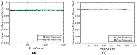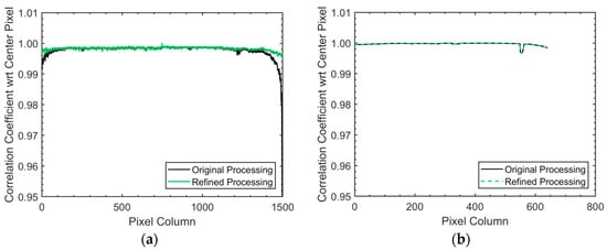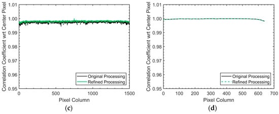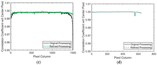 For the CASI imagery, the CCs systematically reduced in value by more than one standard deviation near the edges of the FOV. This reduction was largest for the CASI data derived from the original processing methodology. When compared to the imagery collected on the 23rd, the CASI data from the 24th were characterized by more substantial reductions in the CCs near the edges of the FOV, especially along the left side. The CCs for the SASI imagery were almost identical, regardless of the processing methodology or the acquisition date. The CCs for the SASI imagery were consistently lower than the mean across the FOV from Pixels 548–564. As seen in Figure 13b,d, this reduction appeared to be parabolic in nature, reaching a minimum value of approximately 0.995 and 0.997 in the SASI imagery from the 23rd and 24th, respectively.