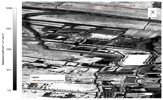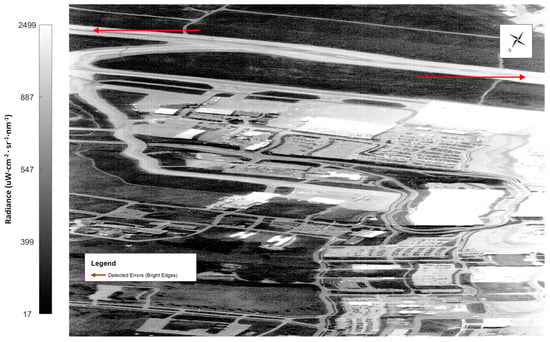Histogram-equalized CASI image (24 June with the original processing) at 393.068 nm. The asphalt road along the south side of the image was brightest along the edge pixels. The errors in the data are highlighted by the red arrows.