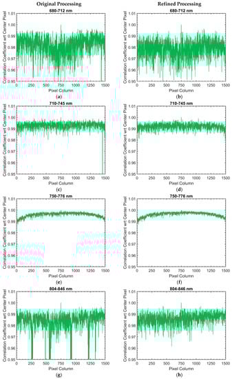 There was a reduction of approximately 0.021 in the CC near the edges of the FOV in Figure 18e,f. The effects associated with these reductions could not be visualized within the imagery. Figure 18g was characterized by sporadic reductions in the CC of greater than 0.05. These reductions revealed potential imaging errors for the spectral window in the following spatial ranges: 256–276, 551–576, 912–936 and 1209–1235. After independently displaying all of the bands in the specified spectral window in greyscale, it was possible to detect groups of non-uniform pixels that noticeably varied in brightness. These groups created distinct “striping” artifacts that can be seen at several spatially-isolated points across the CASI imagery from the 24th with the original processing (Figure 21). This effect was not present in the CASI imagery with the refined processing or Figure 18h.