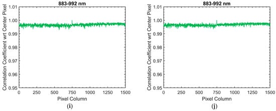 Atmospheric absorption features are distinctive and constant under stable conditions []. As such, the CC was thought to be able to detect inconsistencies in these regions since error-induced changes located within these features are more easily identifiable. As depicted in Figure 8, a CC was calculated between the spectrum from each pixel in the ROI and the designated central reference pixel using only the hyperspectral data that corresponded to each of the approximate wavelength regions identified in Table 2.