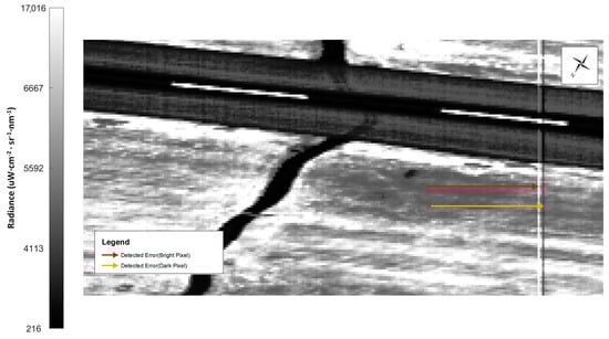 The error within all SASI imagery was located at the same spatial pixels and spectral range. The error could be displayed by visualizing the only band in the 993–1008 spectral range (Figure 16).