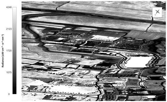 The CCs in Figure 18i,j remained relatively constant with very little variation. The associated imagery was visualized in greyscale with one of the bands from the identified spectral range (Figure 22). No large errors could be seen in any of the analyzed CASI imagery within this spectral range.