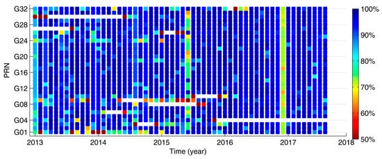 Figure 1 and Figure 2 depict monthly completeness of RT corrections for all GPS satellites from the IGS01 and IGS02 combined products. The IGS03 product is not shown here because it is almost identical to IGS02; slightly more outages are related to GLONASS satellites. Figure 3 shows then the same picture for the CNES product. From the comparison, we can classify problems into three groups: (1) temporal unavailability period of some satellites, e.g., G03, G04, (2) source-specific unavailability, e.g., G01 for CNS91, and (3) satellite-specific incompleteness. The first group is usually caused by the loss of observations due to the upgrade of a satellite, such as replacing the old Block IIA satellites with the new Block IIF satellites or a maintenance identified by satellite unhealthy status. The second and third groups of gaps are caused by data unavailability from a global network and the processing strategy including outlier detection in the product generation. The availability of the corrections is significantly lower for some months (June 2015, December 2016) compared to others, which was caused by the Internet connection failures at GOP when receiving the streams. The source-specific loss of data at IGS02 and CNS91 streams are visible in June 2015 and, these are mainly due to the inconsistent navigation message Issue of Date (IOD) available from the MGEX broadcast and those referred by RT corrections. It can be thus recommended to use consistent RT navigation data and precise correction streams optimally guaranteed by the same provider. In general, the availability of RT corrections is well over 90% for most satellites, which agrees with findings in [33]. It indicates that the RT corrections were provided continuously for use in troposphere monitoring, however, problems can be expected in a kinematic positioning which is more sensitive to the product incompleteness.