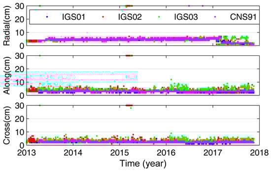 The orbit difference in radial component shows the smallest RMSE for all products, whereas the along-/cross-track components reached slightly larger values. The IGS01 orbit shows the best agreement with respect to the IGS final orbits. Largest differences are observed for the orbits from IGS03, which might be attributed to a different outlier detection method applied when including GLONASS satellites. Time evolution of the orbit comparison for each product and specific component is shown in Figure 4. Coordinate differences greater than 30 cm are plotted at the top horizontal lines of each graph. Orbits from the IGS01 stream are less affected by the outliers compared to IGS02 and IGS03 products, as indicated by outliers mainly during March 2015. The switch from the IGS08 to the IGS14 PCO model (28 January 2017) can be observed in statistics of the radial component. It seems that the CNS91 product used the new IGS14 model as of 9 March 2017, while official IGS solutions are difficult to recognize due to most likely asynchronous switches by different contributing providers. Otherwise, the orbit accuracy for all products shows an overall good consistency over the period.