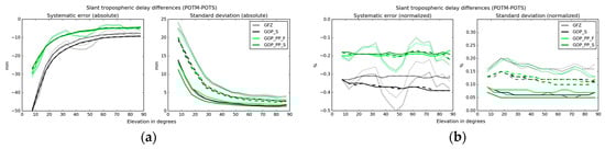 Elevation-dependent absolute (a) and normalized (b) statistics for GOP slant delay differences at POTM and POTS stations using post-processing (PP) product and Kalman filter (F) or backward smoothing (S), GFZ slant delays and old GOP product (GOP_S). Line types indicates model SD (solid), clean SD (dashed), raw SD (dotted).