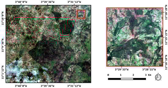 RGB representation of the 5253 × 4797 S2-Koumbia dataset (3 August 2016), with a zoom on the area selected for testing.