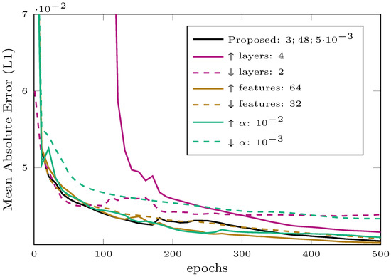 To conclude this section, we present in Figure 4 some preliminary results about the evolution of the loss computed on the validation dataset during the training process for a sample proposed architecture and for some deviations from it. Although the L1 loss (or mean absolute error) has not been directly considered for the accuracy evaluation presented in the next section, which refers to widespread measures of quality, it is strictly related to them and can provide a rough preview of the performance. For the sake of simplicity, we gather in Figure 4 only a subset of meaningful orthogonal hyperparameter variations. The first observation is that after 500 training epochs, all models are about to converge, and doubling such a number would provide a negligible gain as tested experimentally. Decreasing the number of layers w.r.t. the reference architecture implies a considerable performance drop. On the other side, increasing the network complexity with an additional layer does not bring any gain. The number of features is also a factor that can impact on accuracy. Figure 4 reports the cases when the number of features for the first layer is changed from 48 (proposed) to either 32 or 64. In this case, however, the losses are very close to each other, with the proposed and the 64-feature case almost coincident at the end of the training. The last two plots show the impact of the learning rate , and again, the proposed setting (5 ×) is “optimal” if compared with neighboring choices ( and ). It is also worth underlining that using an higher learning rate, e.g., , one can induce a steep decay in the early phase of training, which can be paid with a premature convergence.