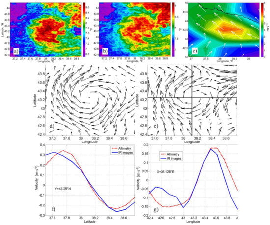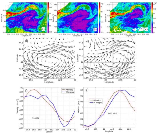 (a–c) AVHHR SST in the vicinity of the Sevastopol anticyclone on 13 May 2005 09:11 (a), 13 May 2005 13:55 (b), 14 May 2005 00:34 (c); (d,e) Surface current calculated for 13 May 2005 from altimetry (d), from IR images (solid line—sections) (e); (f,g) meridional section of u (f), zonal section of v (g) (red line—altimetry; blue—IR images).