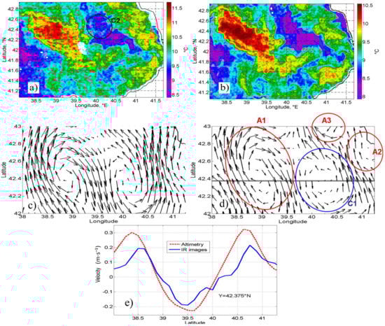 (a,b) AVHHR SST at 11 January 2007 19:40 (a), 12 January 2007 07:56 (b); (c,d) Surface current calculated for 12 January 2007 from altimetry (c), from IR images (solid line—section) (d); (e) meridional section of u (red line—altimetry; blue—IR images).
