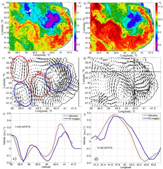 Scene 3 demonstrates double eddy system observed in the eastern part of the Black Sea on 11 January 2007. It consisted of a warm anticyclone A1 (with SST~11°) and a colder cyclonic eddy C1 (SST~8°) with radiuses about 100 km (Figure 3a,b). Both the cyclone and anticyclone were oriented in the northwest–southeast direction, corresponding to the Rim current direction in this area. Currents computed from the satellite imagery represented well the dynamic structure of this system (Figure 3c,d), and it was also clearly defined by altimetry measurements. Both methods show that the radius of these eddies was about 60 km and the orbital velocity reached 0.2–0.3 m·s−1 (Figure 3e).