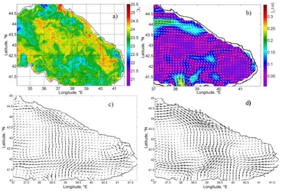 The SST field for 26 June 2007 and the calculated basin-scale circulation in the east part of the Black Sea, derived from both satellite methods, are presented in Figure 5a,c,d. Both methods agree as to the spatial structure and magnitudes of the currents. The main feature of the Black Sea circulation- the large-scale Rim current encircling the Black Sea in the cyclonic direction along the continental slope was successfully reproduced by altimetry and satellite imagery. A mesoscale cyclone with a radius of ~40 km and a maximal orbital velocity of ~0.2 m·s−1 is observed in the southeast Black Sea. Rim current splits into two branches near this cyclone, with the branch to the west of the cyclone being significantly wider compared to the narrower jet at its east part (Figure 5c,d).