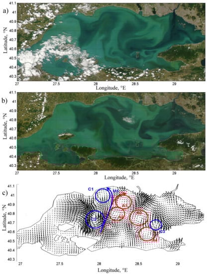 The Marmara Sea is the first link between the Black Sea and the Atlantic Ocean. Its dynamics plays a very important role in the interbasin exchange and inflow of the Mediterranean waters in the Black Sea [14,60,61,62,63,64]. On the other hand, the Black Sea dynamics significantly affect the Marmara Sea ecosystem and thermohaline variability [82]. However, due to the small geometrical size of the Marmara Sea (only 70 km in the meridional direction and ~150 km in the zonal direction) and the number of islands in the basin, the reconstruction of its dynamics is a challenging task for the satellite altimetry. In these conditions, the use of high-resolution imagery is one way to investigate the Marmara Sea circulation.