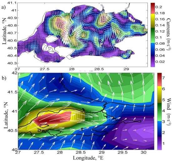 (a) Current magnitude (m·s−1) computed from 4D-Var assimilation of Modis imagery; (b) wind velocity over the Marmara Sea on 25 May 2015 18:00 UTC.