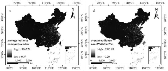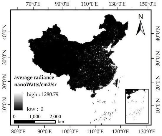 The source of all the NTL imageries used in these studies is the EOG, the NGDC of NOAA []. Two configurations of the NPP-VIIRS composites are available: the first is called “vcmcfg”, and the second is called “vcmslcfg”. The first excludes any data contaminated by stray light (typically solar illumination) while in the second configuration, data impacted by stray light are corrected but not removed []. The second configuration composites include stray light correction, and contains more data in northern latitudes, and is therefore better for more complete spatial and temporal coverage. We selected the second products according to the procedure used by Levin and Zhang []. The NPP-VIIRS Day/Night Band (DNB) month composite data were collected from January 2014 to December 2017. In 2014, 2016, and 2017, the lighting data are only available by monthly composites. In 2015, the light data are available by both monthly composites and annual composites. In addition, brightness of artificial NTL that is useful information for quantitatively assessing socio-economic factors is contaminated by seasonal noise, monthly changes in nighttime brightness were correlated with monthly changes in snow cover (which may vary from year to year), and are thus not suitable for analyzing spatial inequalities by using the NTL products of all months []. We only chose monthly composites of NPP-VIIRS data from July to September in China. Because of the snow cover area in China from July to September is the least, in other months, snow cover will increase significantly []. The average value of the lighting from July to September is used to represent the average lighting intensity of the whole year (Figure 1).