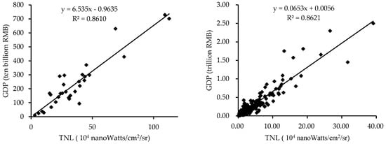 Unlike the DMSP-OLS NTL data, the released NPP-VIIRS NTL data have not been filtered to remove light detections associated with fires, gas flares, volcanoes, and background noise. Fortunately, in 9 March 2017, the annual composites of 2015 were first released with the “vcm” version, which excludes any data impacted by stray light. Further processing has been done on the annual products to screen out ephemeral lights and background (non-lights). We obtained the NPP-VIIRS night-time radiance values by average DNB radiance values’ products named “vcm-orm-ntl” (VIIRS Cloud Mask—Outlier Removed—Night-time Lights) containing cloud-free average radiance values that have undergone an outlier removal process to filter out fires and other ephemeral lights, with background (non-lights) set to zero. The “vcm-orm-ntl” NTL imagery of China in 2015 are shown in Figure 2. All the NTL imagery was reprojected to an Albers Conic Equal Area projection with a spatial resolution of 500 m. The annual composites NTL satellite imagery of 2015 has been shown to be highly related to economic parameters both at province and prefectural levels. The TNL-GDP relationship at the province and prefecture level were evaluated through linear regressions (Figure 3). At the provincial and prefectural level, the R2 values of the TNL from original NPP-VIIRS data and GDP were 0.8610 and 0.8621, respectively. Thus, annual composites NTL satellite imagery of 2015 is a good reference image.