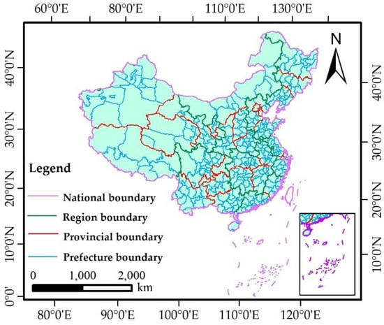 The GDP data and population data were obtained from the China Statistical Yearbook for regional economy 2013–2014 []. As the China Statistical Yearbook for regional economy is no longer published since 2015, the GDP data and population data in 2015 and 2016 were obtained from the Statistical Yearbooks of every province. To apply NPP-VIIRS NTL data in estimating regional inequality at a multi-scale level, we used China’s provincial and prefecture level administrative regions for analysis. In China, there are three major levels of administrative areas: province, prefecture, and county. In this study, all the provincial regions, except for Hong Kong, Macau, and Taiwan, were selected, resulting in 31 provincial and 341 prefectural regions for analysis (Figure 4). Furthermore, we modified the inconsistencies in the raw statistical data for 2014–2017 that were caused by administrative division adjustments. The boundary data of the administrative divisions of mainland China, including national, provincial, and prefectural boundaries, were obtained from the National Geomatics Centre of China.