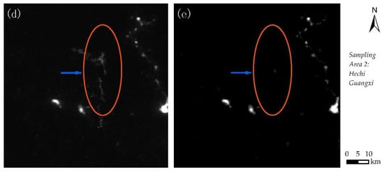 (a) The corrected NPP-VIIRS NTL data of mainland China in 2014. Two regions bounded by red rectangles are Bayingolin, Xinjiang (sampling area No.1) and Hechi, Guangxi (sampling area No.2). The (b) original and (c) corrected image of sampling area No.1; and the (d) original and (e) corrected image of sampling area No.2). The two example lit areas that were removed during correction are indicated by red circles and blue arrows.
