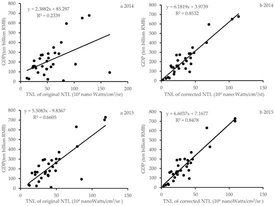 The accuracy of NTL data was assessed using province-level and prefecture-level statistical GDP. The results of linear regression between TNL and GDP evaluated at both province and prefecture levels are shown in Figure 6. Both at the provincial level and the prefectural level, the R2 value of the TNL from corrected NPP-VIIRS data and GDP was much higher than that of the TNL from original NPP-VIIRS data and GDP. In 2015, for instance, the R2 value of corrected data was 0.8478, whereas that of original data was 0.6605 at the provincial level. Moreover, at the prefectural level, the corrected data also showed a better capacity in estimating GDP. In 2015, for instance, the R2 value of corrected data was 0.8566, whereas that of original data was 0.7367 at the prefecture level. Overall, the statistical relationship between the corrected data and GDP is most significant at both provincial and prefectural levels, indicating that the NTL is suitable and reliable for GDP estimation.