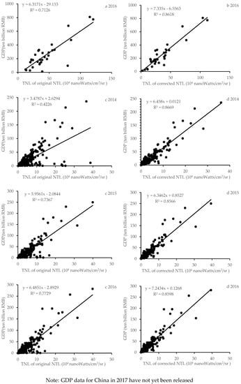 The monthly mosaic of NPP-VIIRS imagery is a preliminary product, which has not been filtered to remove light detections associated with fires, gas flares, volcanoes, and background noise. Therefore, NPP-VIIRS NTL data should be calibrated before they are used to estimate socioeconomic variables. Due to the annual composite of NPP-VIIRS data in 2015, which has undergone an outlier removal process to filter out fires and other ephemeral lights, with background (non-lights) set to zero, it was applied to calibrate the NTL data in 2014, 2015, 2016 and 2017. Moreover, the calibration method which has been well developed by Li et al. [] is extended to process the NPP-VIIRS NTL data in our study to reduce the discrepancies.