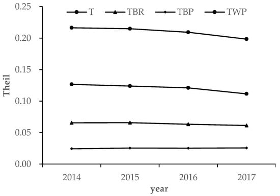 Equation (10) is the two-stage Theil inequality decomposition equation, in which the overall regional economic inequality is decomposed into the within-province component (TWP), between-province component (TBP), and between-region component (TBR). The within-province component is a weighted average of within-province income inequalities (Tij), while the between-province component is a weighted average of between-province income inequalities (Tpi).