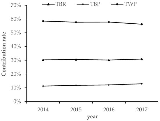 Contribution rate of Within-province inequality (TWP), Between-region inequality (TBR), and Between-province inequality (TBP) to overall inequality from 2014 to 2017.
