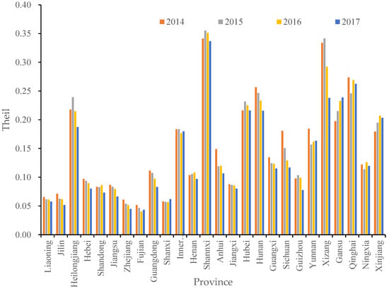 Secondly, the spatial distribution of mean of Theil index in every province was mapped, as shown in Figure 10. The Theil index was classified into four groups using the Jenks Natural Breaks Classification method, which is done by seeking to minimise the average deviation from the class mean while maximising the deviation from the means of the other groups []. Great disparities in the Theil index have been identified in China, as shown in Figure 10. There are 12 provinces in the first group with a Theil index from 0.045 to 0.091, indicating that the inequalities in these provinces is the smallest. Moreover, these 12 provinces, including Shandong, Zhejiang, and Jiangsu, are mainly located in Eastern China. The second group with a Theil index of 0.092–0.144 included 9 provinces, which demonstrates that the inequalities in these provinces is relatively small. These provinces, including Guangxi, Guizhou, and Sichuan, are mainly located in Southwest China. As for the third group, it has 7 provinces with a Theil index of 0.145–0.238, showing that the inequalities in these provinces is large. It can be seen from Figure 10 that most of these 7 provinces, including Gansu, Xinjiang, and Shannxi, are located in Northwest China. Regarding the last group, it only included 3 provinces with a Theil index of 0.239–0.347, which reveals that the inequality in Shannxi is the largest.