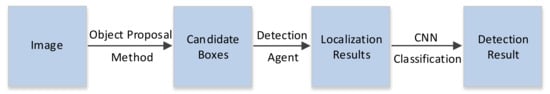 The works in [,,] took the object detection problem as the Markov Decision Process and trained detection agent based on reinforcement learning. The detection agent adopts the top-down searching process that firstly analyses the global image and then narrows down the local regions that contain object information step by step. However, these detection methods based on reinforcement learning only detect fixed number of objects, which can not address the challenge of aircraft detection in remote sensing images.