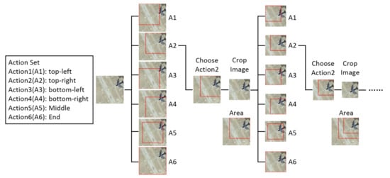 where, at time t, the region is , the state is , and the Intersection-over-Union is . Then, the agent takes action , the region  transfers into , the state transfers into , and the Intersection-over-Union changes to . When the IoU is increased, the agent gets a positive +1 reward. Otherwise, the agent gets a negative −1 reward.