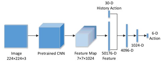 The first fully connected layer is the connection of two components: the 30-d history action and the 50176-d image features generated from the last convolutional layer of MobileNets. The second fully connected layer is combined with the Rectified Linear Unit (ReLU) and Dropout layers, and has 4096 neuron nodes. Then, the third fully connected layer is also combined with the ReLU and Dropout layers, and has 1024 neuron nodes. Finally, the last fully connected layer represents the q value of the action, and it has six output nodes in our work.