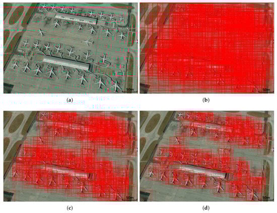 Display of the results through different methods that extract candidate boxes. All results are located with red bounding boxes. (a) the original remote sensing image; (b) the results generated by EdgeBoxes []; (c) the results generated by CEdgeBoxes []; and (d) the results generated by the restricted EdgeBoxes.