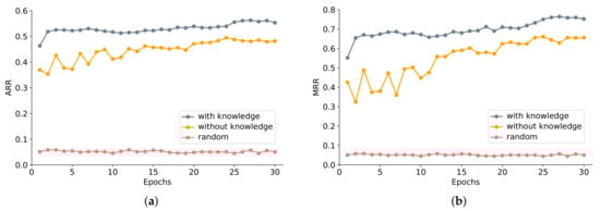 Figure 5 shows how the performance of the agents improves at different epochs on the testing 500 images. As Figure 5a,b showed, the with-knowledge agent performs better than the without-knowledge agent and random action agent. After 30 epochs, the with-knowledge agent achieves 0.56 ARR and 0.76 MRR, the without-knowledge agent achieves 0.48 ARR and 0.65 MRR, and the random action agent that randomly chooses actions only achieves 0.05 ARR and 0.05 MRR.
