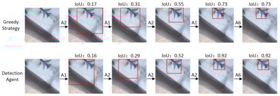 Figure 8b shows the bounding boxes generated by the detection agent in one test image. Compared with Figure 8a, the bounding boxes in Figure 8b converge on the aircraft.