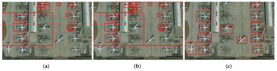 The detection results of different aircraft detection frameworks. (a) the detection result in the condition that the largest number of actions in HODRL [] is set to 150; (b) the detection result in the condition that the largest number of actions in HODRL [] is set to 200; and (c) the detection result generated by the RL-CNN detection framework.