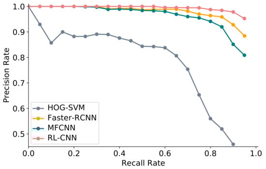 Precision–Recall Curves of HOG-SVM, MFCNN [], Faster-RCNN [] and our RL-CNN aircraft detection model. Our RL-CNN framework achieves the best performance.