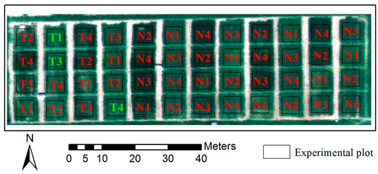 The experimental site was at the Xiaotangshan National Precision Agriculture Research and Demonstration Base, located in Changping District, Beijing, Latitude of 40°00′N–40°21′N, longitude of 116°34′E–117°00′E, altitude of 36 m. The site measured 84 m east-west, 32 m north-south, and contained 48 (6 m × 8 m) plots (Figure 1).