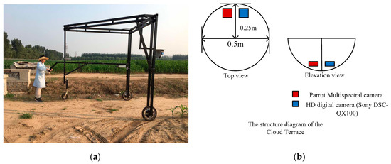 Figure 2 shows the platform, which consists of a three-wheeled double-deck steel-frame structure. The length, width, and height of the platform are respectively 3 m, 3 m, and 3.5 m. The payload of the platform is 20 kg. The diameter of the Cloud Terrace is 0.5 m. The height control range of the sensor cantilever is 0.5 m–4 m. The speed of the platform is 1 m/s and the endurance time of the platform is 2 h. The sensor is hung from the cloud terrace, which is below the cantilever at the front end of the platform. The platform is powered by an on-board accumulator located in the middle of the platform, which supplies power to two brushless motors located at the front wheels, thereby driving the platform. The two front wheels of the platform are fixed power wheels, and the rear wheel provides steering. The minimum turning radius of the vehicle is 3 m. Both the front and rear wheels of the platform are equipped with wide rubber tires and anti-skid chains, and can handle undulating gaps of no more than 10 cm. The cloud terrace has multiple holes for hanging equipment and can simultaneously accommodate two high-definition digital cameras, a multispectral camera, a hyperspectral camera, a thermal imager, and a lidar camera for simultaneous data acquisition. The rear column of the platform contains a console to hold two laptops for data storing and real-time processing. The tail of the platform houses the operator control mechanism, which controls the speed and steering of the system. In this experiment, this platform is equipped with a multispectral camera (Parrot, Paris, France) with a resolution of 1280 × 960 and field of view of 47.2°. The spectral range of the multispectral camera is 550 nm–790 nm with a ground resolution of 1.13 mm/pix. The focal length of the multispectral camera is 35 mm. It is equipped with another high-definition digital camera (Sony DSC-QX100, Tokyo, Japan) with a ground resolution of 0.56 mm/pix and field of view of 60°.