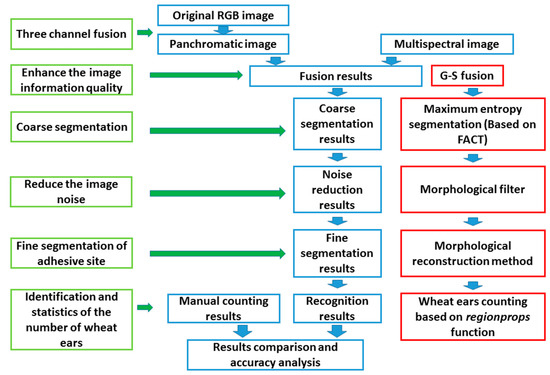 The image processing technology based on single data source cannot guarantee spectral resolution and image resolution simultaneously because of the singleness of data sources. As a way to solve this problem, image fusion keeps the spectral characteristics of low resolution multispectral images and gives it high spatial resolution. Kong et al. proposed an infrared and visible image fusion method based on non-subsampled shearlet transform and a spiking cortical model [3]. Li et al. [4] introduced a novelty image fusion method based on a sparse feature matrix. Ma et al. [5] discussed an infrared and visible image fusion method based on a visual saliency map. Zhang et al. [6] proposed a fusion algorithm for Hyperspectral Remote Sensing Image Combined with Harmonic Analysis and Gram-Schmidt Transform which shows a good performance during the fusion operation between different resolution images. Since the Gram-Schmidt Transform has the above characteristic, it was used in our work. The key to using image processing to count wheat spikes is image segmentation [7]. In recent years, the segmentation of RGB images, or more generally multispectral images, has gained significant research attention. For example, Ghamisi et al. [8] proposed a heuristic-based segmentation technique for application to hyperspectral and color images, and Su and Hu discussed an image-quantization technique that uses a self-adaptive differential evolution algorithm, with the technique being verified by using standard test images [9]. Furthermore, Sarkar and Das [10] proposed a segmentation procedure based on Tsallis entropy and differential evolution. In image segmentation based on multi-source data, three different image features can be extracted according to different characteristics of target objects as a basis for separation of soil background: color, texture, and sharp [11]. However, at the filling stage, wheat ear and leaf have similar texture features, and cannot be identified accurately through the difference of texture [12]. Meanwhile, the severe adhesion between wheat ears is so serious that it is impossible to obtain accurate sharp information [13]. Based on these considerations, the color feature is used as the basis for image segmentation.
