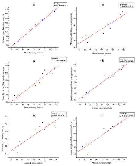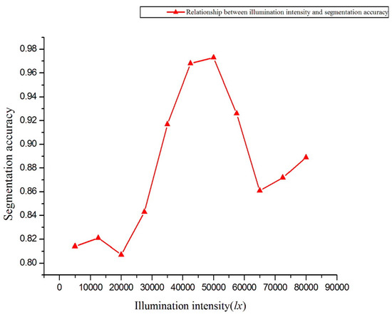 Figure 9 shows that, when the illumination intensity is within the range of 35,000–55,000 lx, the precision of the segmentation method is satisfactory. In the interval 5000–35,000 lx and 35,000–80,000 lx, the segmentation precision decreases significantly, which indicates that the proposed method is very sensitive to illumination intensity [48].