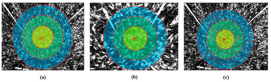 Segmentation accuracy within different radii upon using proposed method. The yellow, green, and blue areas indicate an observation radius of 0–0.25 m, 0.25–0.5 m, and 0.5–0.75 m. The point A is the ortho center of the image. (a) Observation range analysis in T1 plot; (b) Observation range analysis in T3 plot; (c) Observation range analysis in T4 plot.