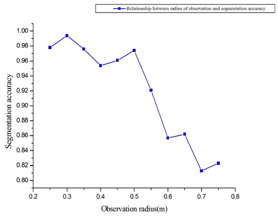 Figure 10 shows that, when the observation radius reaches 0.5 m, using the proposed method of segmentation and recognition can achieve results with good statistics. Extending the radius to 0.5–0.75 m results in a rapid decrease in the accuracy of the algorithm (Figure 11).