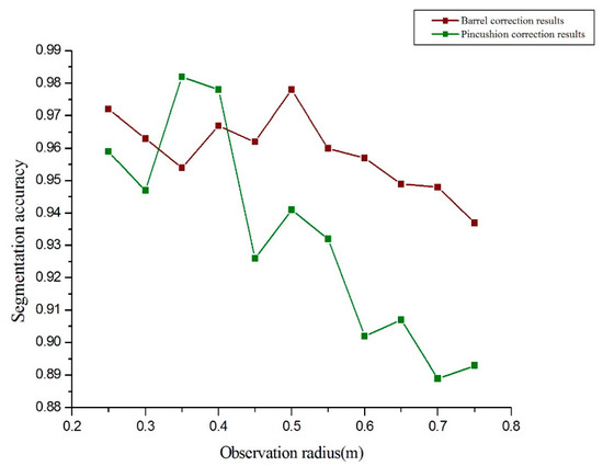 Figure 12 shows that barrel correction significantly improves the image segmentation accuracy when the observation radius continues to expand [55]. For small observation radius, pincushion correction leads to slight improvement of the image segmentation accuracy [56], but a significant improvement in accuracy occurs for a larger observation radius. We thus conclude that the main factor leading to the decrease in accuracy is the edge barrel distortion when the segmentation area increases [57].