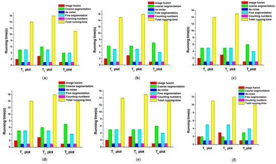 Comparison of running-times by using different coarse-segmentation methods. (a) Coarse-segmentation with Minimum cut; (b) Coarse-segmentation with Edge detection; (c) Coarse-segmentation with fuzzy clustering; (d) Coarse-segmentation with snake model; (e) Coarse-segmentation with region growth; (f) Coarse-segmentation with proposed method.