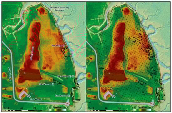 In eastern North America, there is a boon in the amount of publicly available LiDAR and while such data was not created with archaeology in mind, researchers have been making full use of this resource [,,,,]. LiDAR, briefly, uses an instrument that emits and receives a laser that records spatial information via a high precision global positioning system (see []). The scanner sends out thousands of pulses that are measured in the time it takes to reflect back to the receiver. These measurements along with their spatial coordinates can then be used to compute distances to objects. This information then can be used to create maps of ground surface, vegetation, roads, and archaeological features (see [,]). We obtained the Santa Elena LiDAR data from the State Government of South Carolina. We processed the data using the ArcMap 10.5 LAS toolset by ESRI (Redlands, California, USA) (Figure 2).